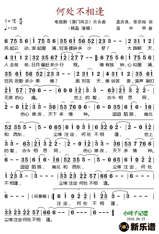 韩磊演唱的何处不相逢(电视剧《澳门风云》片头曲)歌词,何处不相逢(电视剧《澳门风云》片头曲)简谱.