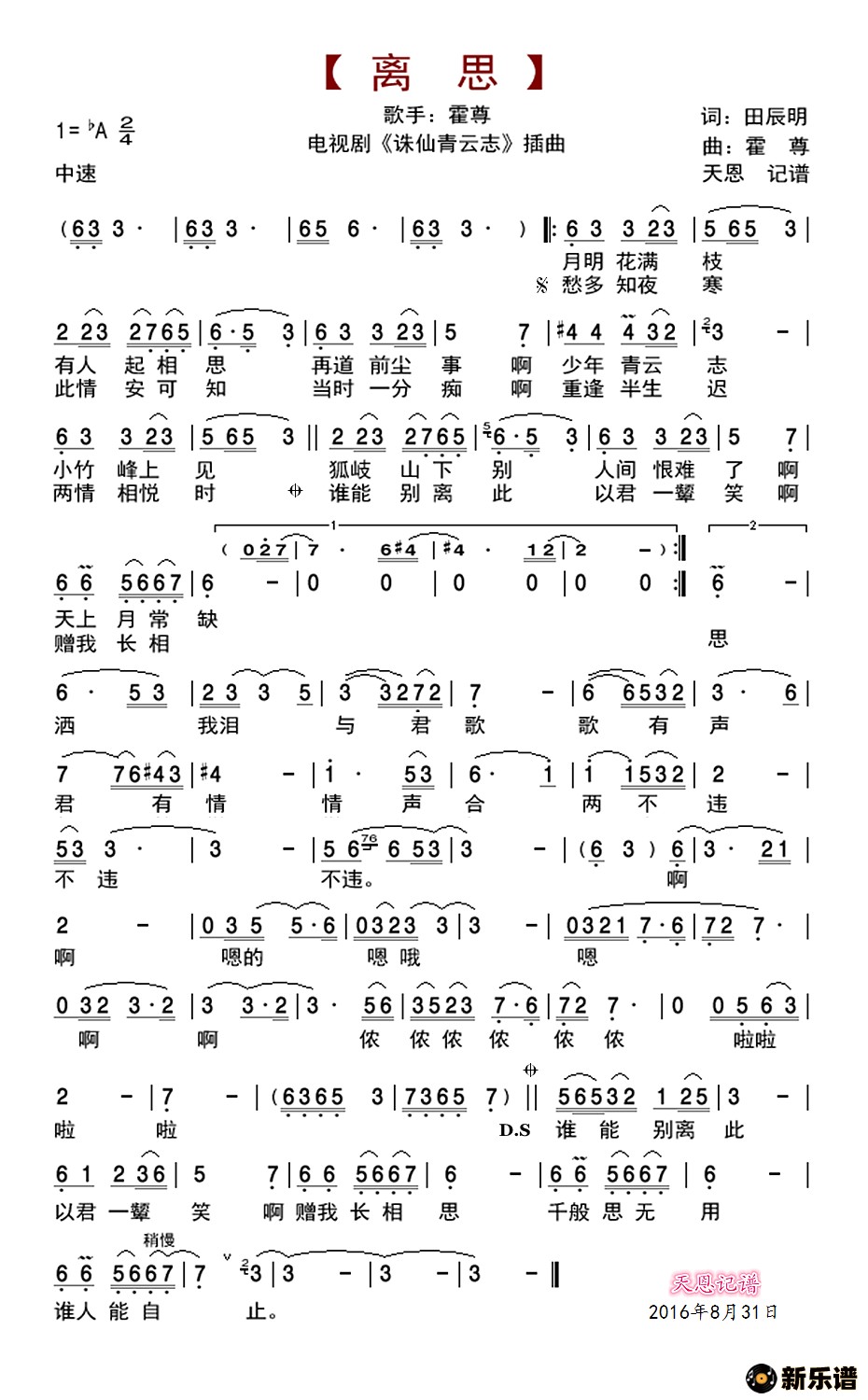 霍尊演唱的离思(电视剧《诛仙青云志》插曲)歌词,离思(电视剧《诛仙青云志》插曲)简谱.