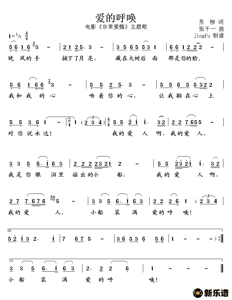 刘欢演唱的爱的呼唤歌词,爱的呼唤简谱.