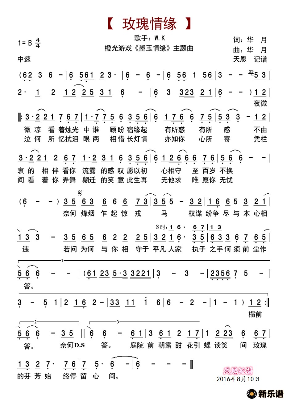 W.K演唱的玫瑰情缘(橙光游戏《墨玉情缘》主题曲)歌词,玫瑰情缘(橙光游戏《墨玉情缘》主题曲)简谱.