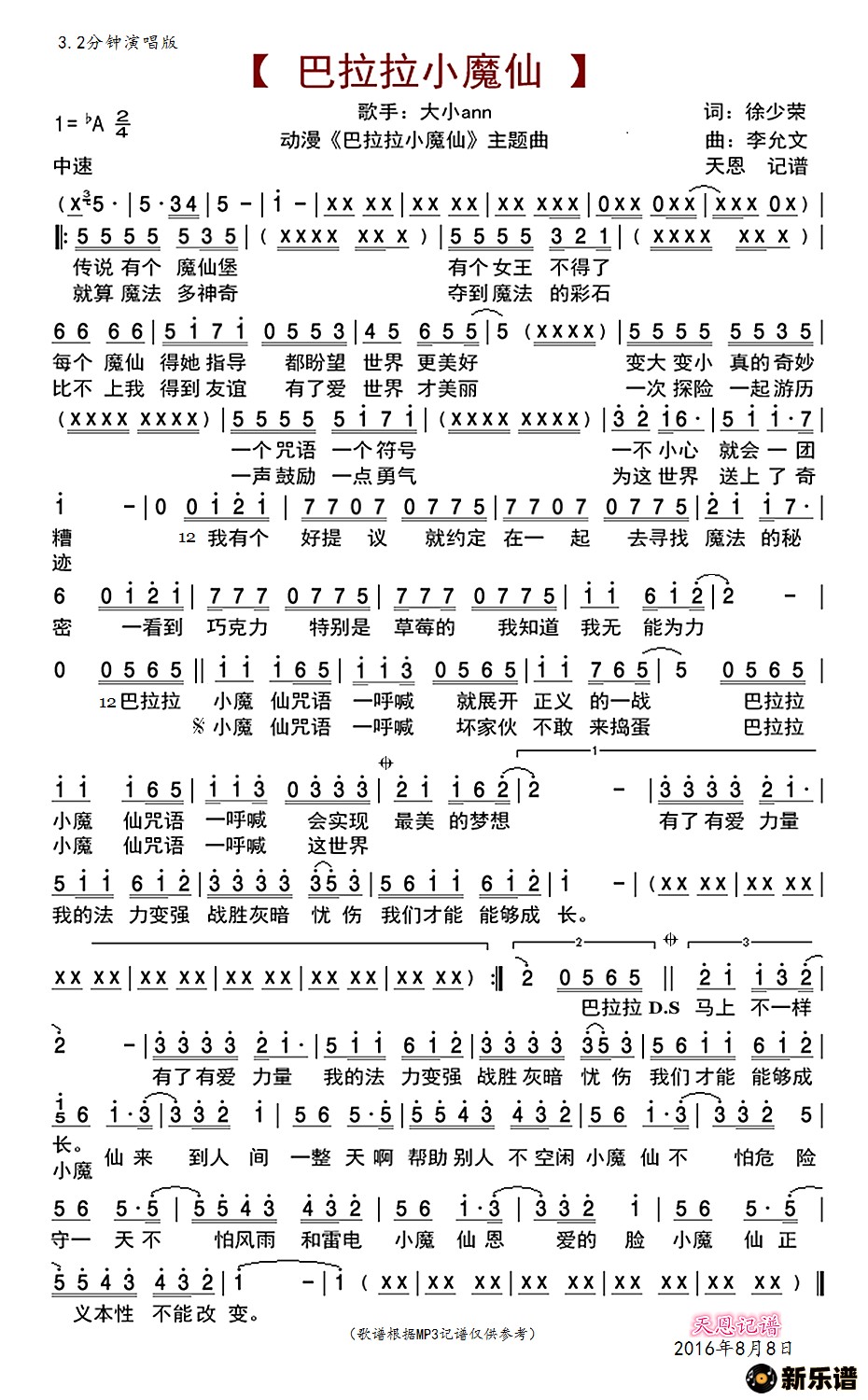 大小ann演唱的巴拉拉小魔仙3.2(动漫《巴啦啦小魔仙》主题曲)歌词,巴拉拉小魔仙3.2(动漫《巴啦啦小魔仙》主题曲)简谱.