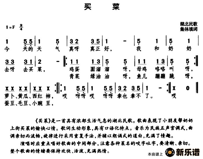 演唱的买菜(湖北民歌)歌词,买菜(湖北民歌)简谱.