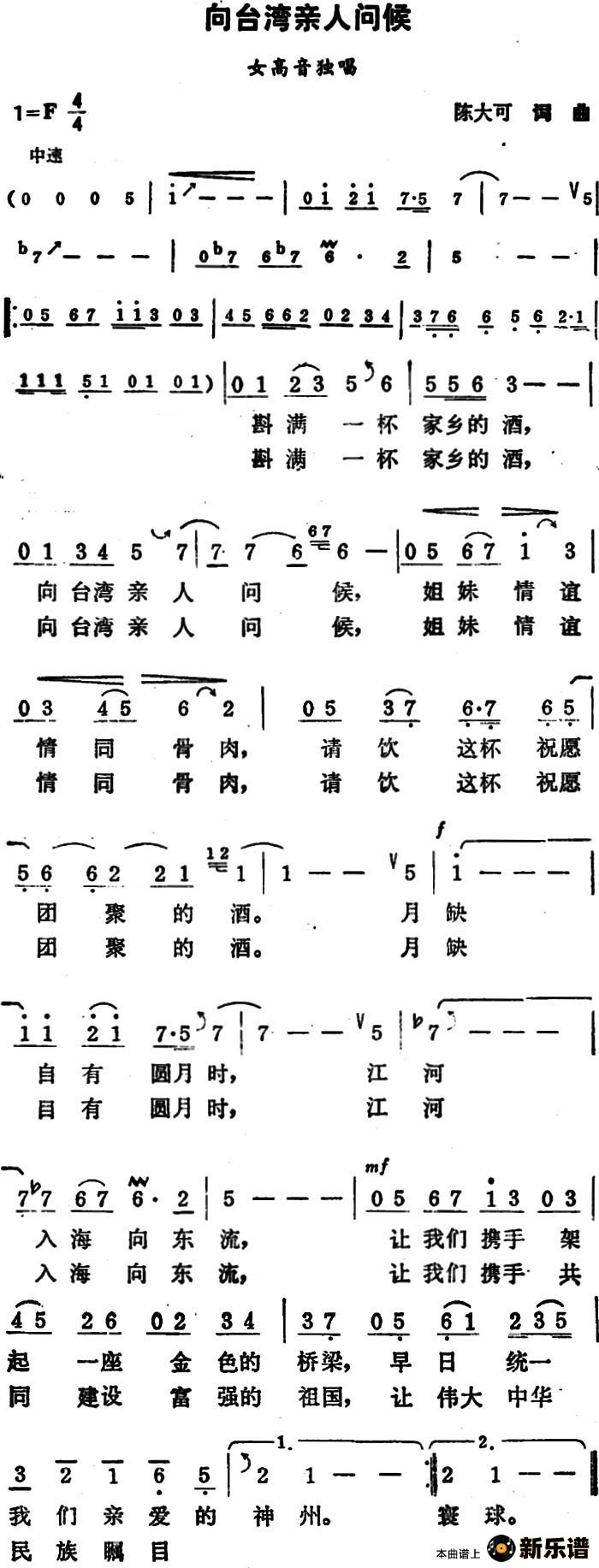 演唱的向台湾亲人问候歌词,向台湾亲人问候简谱.