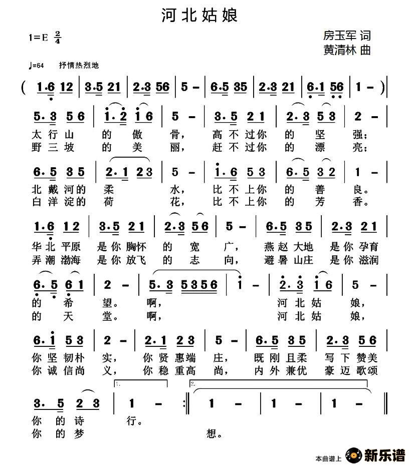 演唱的河北姑娘歌词,河北姑娘简谱.