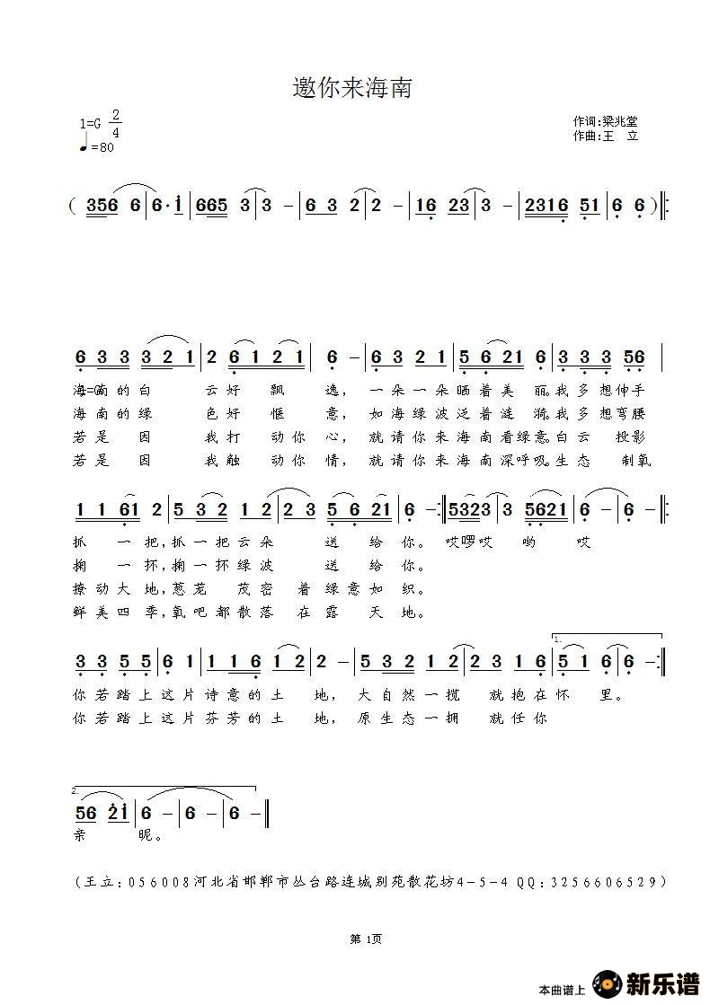 演唱的邀你来海南歌词,邀你来海南简谱.