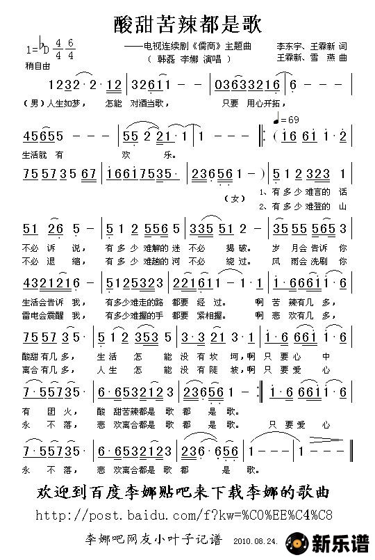韩磊/李娜演唱的酸甜苦辣都是歌(电视剧《儒商》主题曲)歌词,酸甜苦辣都是歌(电视剧《儒商》主题曲)简谱.