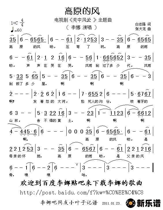 李娜演唱的高原的风(电视剧《关中风云》主题曲)歌词,高原的风(电视剧《关中风云》主题曲)简谱.