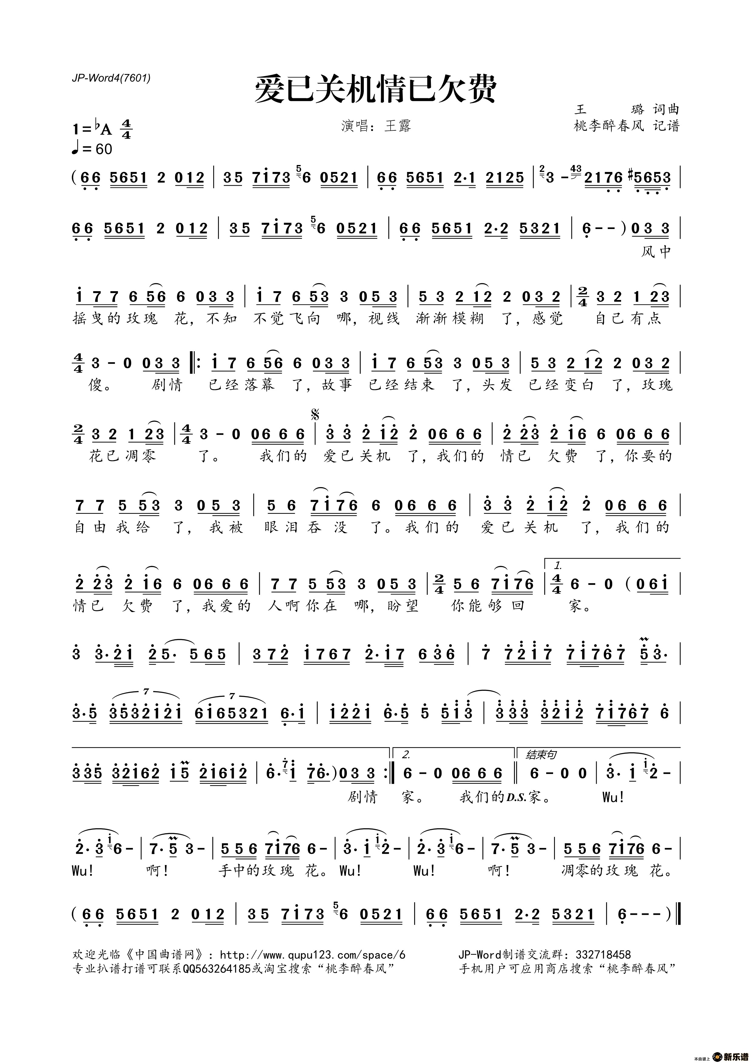 王露演唱的爱已关机情已欠费歌词,爱已关机情已欠费简谱.