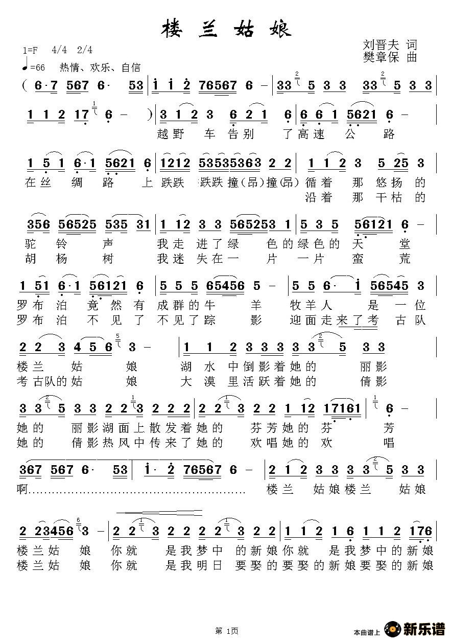 演唱的楼兰姑娘歌词,楼兰姑娘简谱.