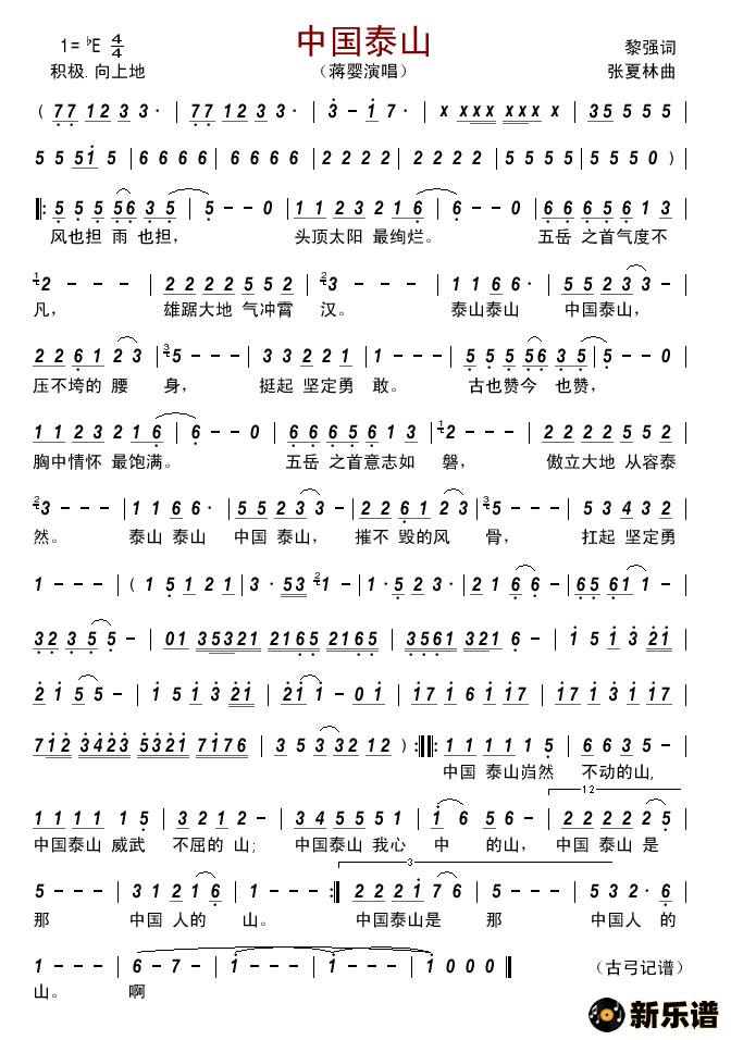 蒋婴演唱的中国泰山歌词,中国泰山简谱.
