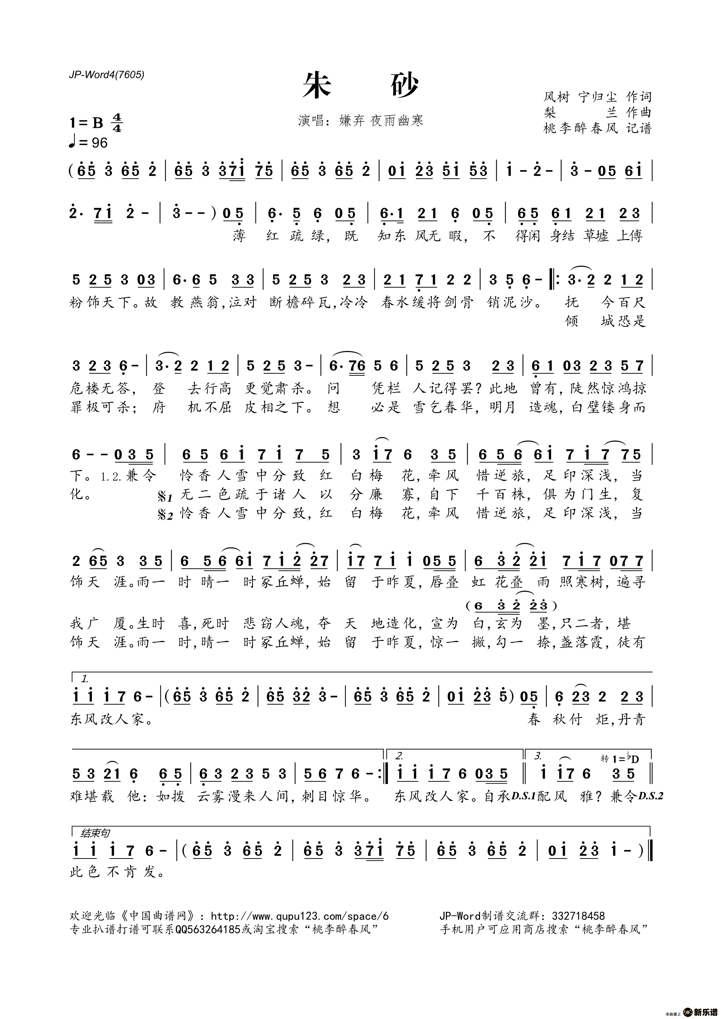 《朱砂》简谱 嫌弃 夜雨幽寒-桃李醉春风制谱