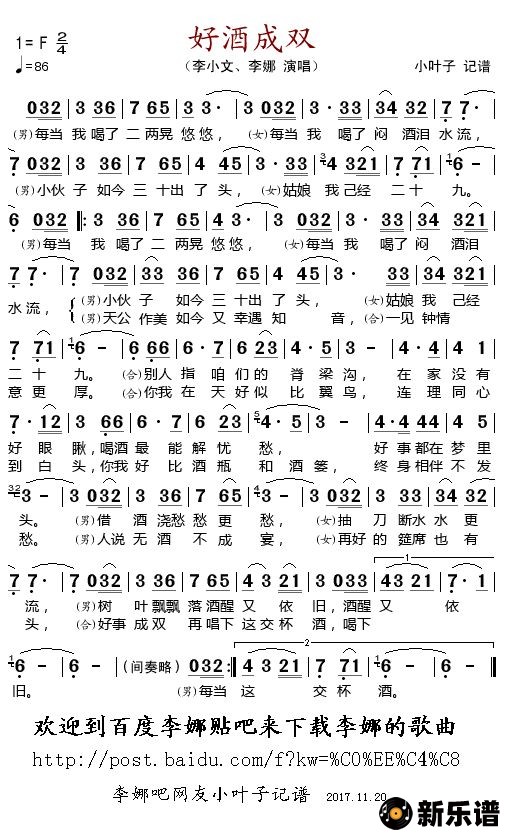 《好酒成双》简谱 李小文/李娜-小叶子制谱