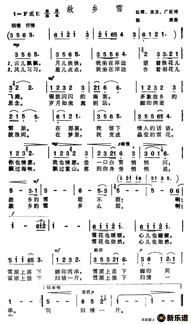 演唱的故乡雪歌词,故乡雪简谱.