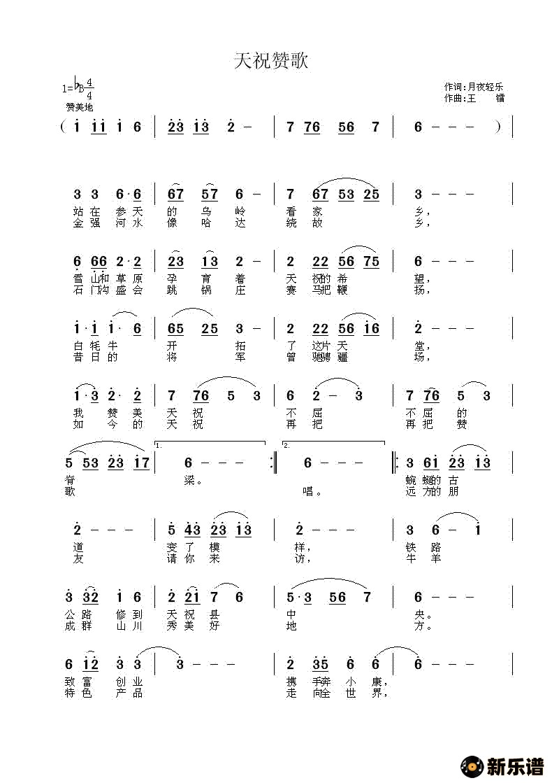 演唱的天祝赞歌1歌词,天祝赞歌1简谱.