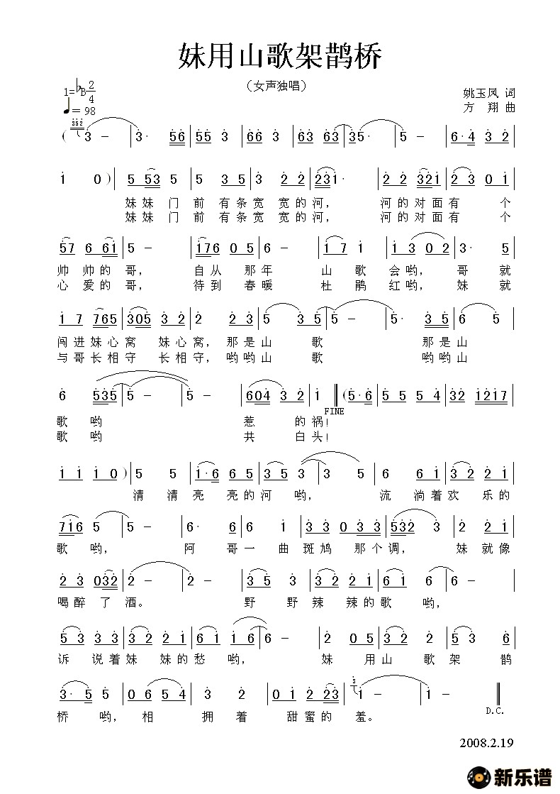 演唱的妹用山歌架鹊桥歌词,妹用山歌架鹊桥简谱.