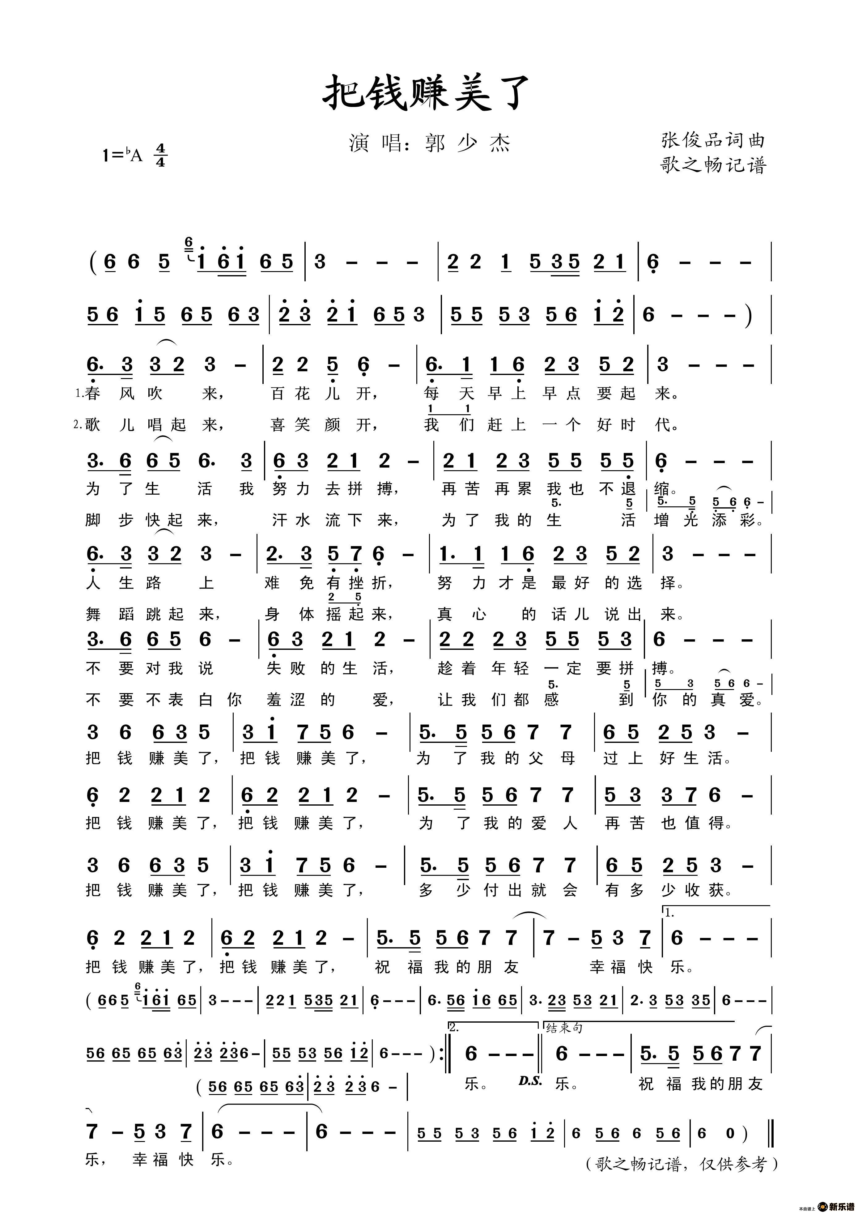 郭少杰演唱的把钱赚美了歌词,把钱赚美了简谱.