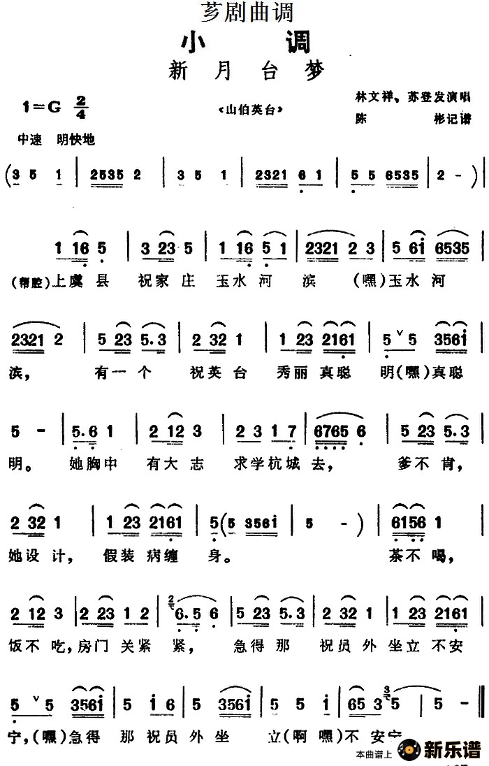 林文祥、苏登发演唱的[芗剧曲调]新月台梦(选自《山伯英台》)歌词,[芗剧曲调]新月台梦(选自《山伯英台》)简谱.
