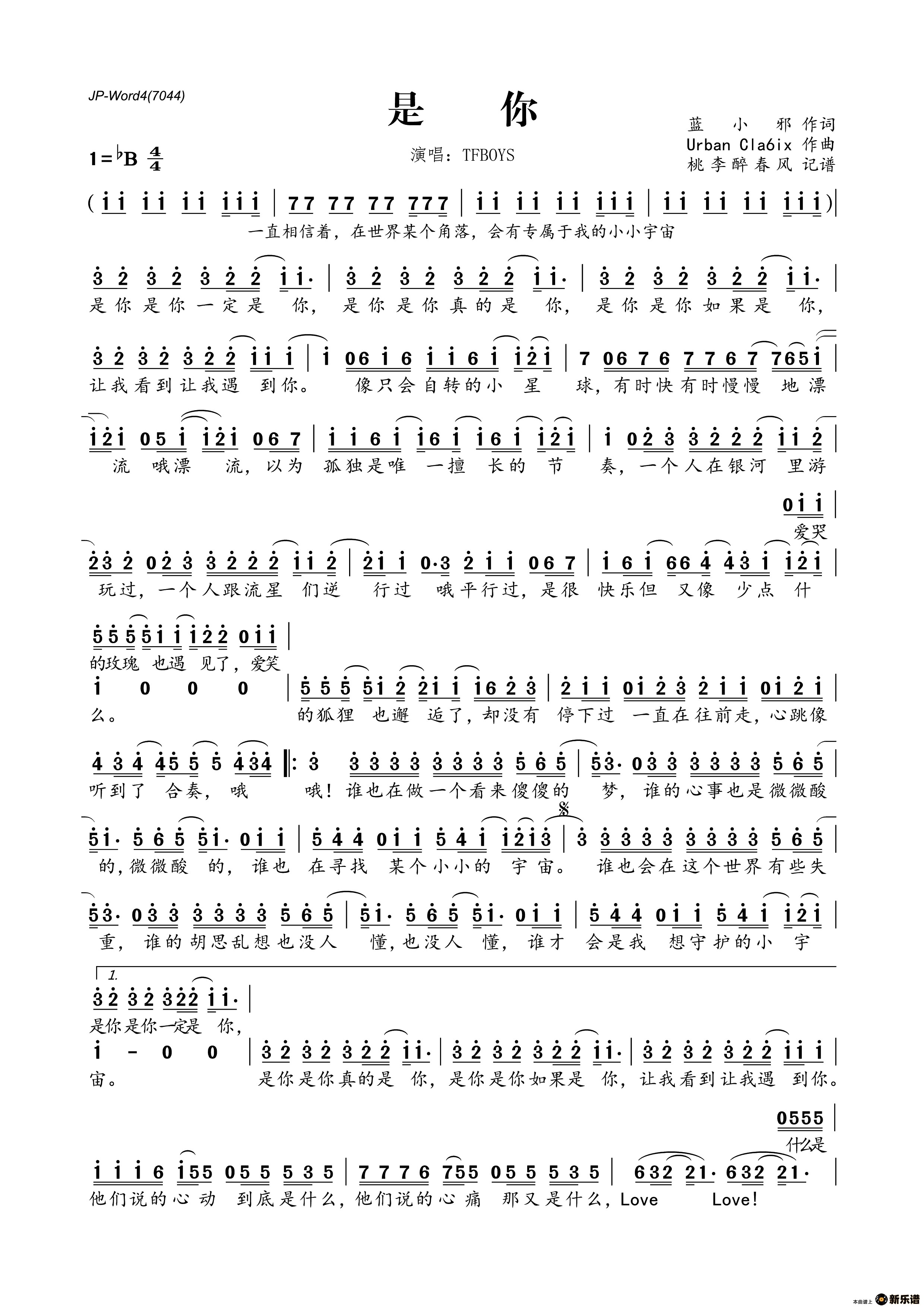 TFBOYS演唱的是你歌词,是你简谱.