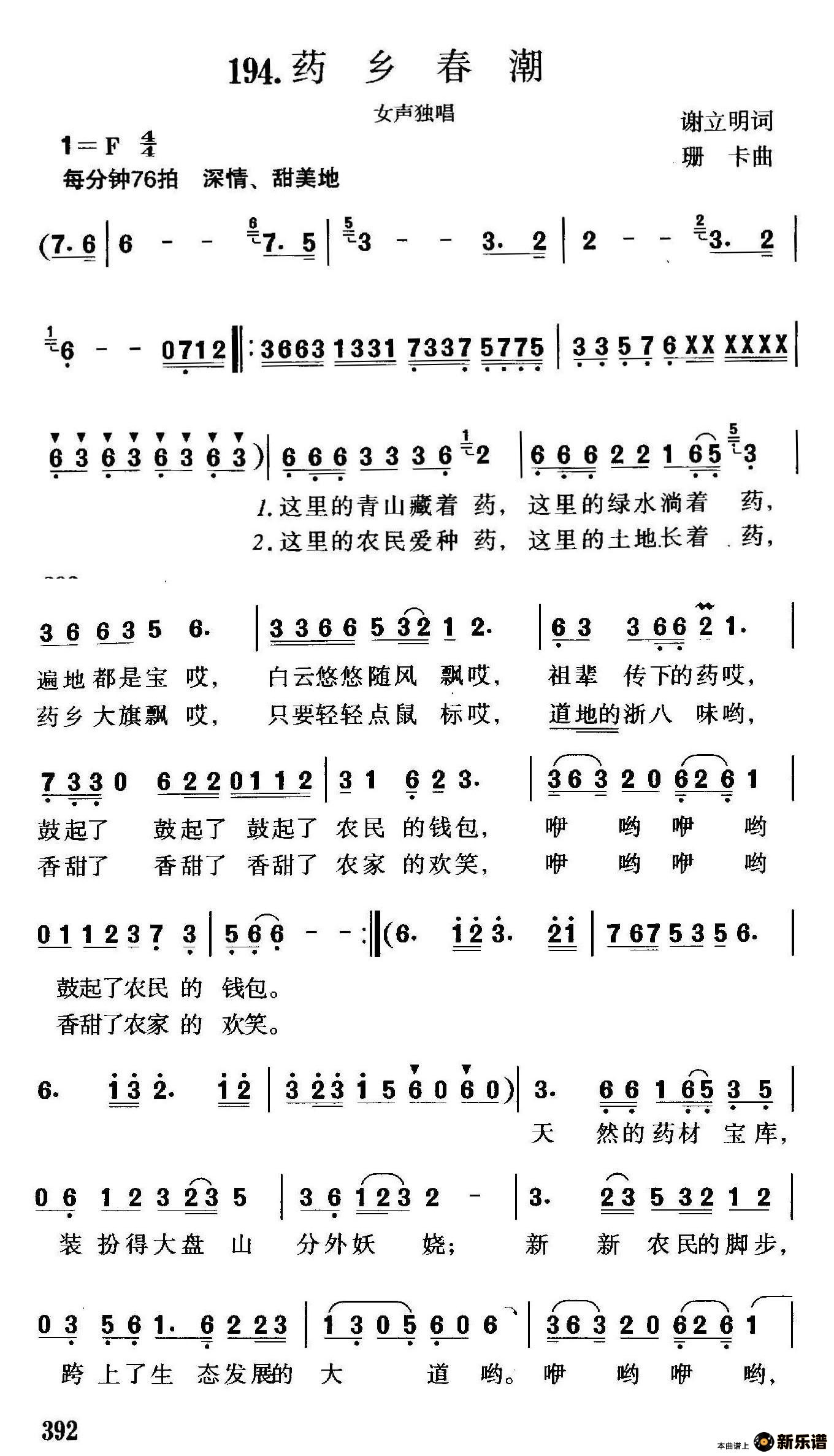 演唱的药乡春潮歌词,药乡春潮简谱.