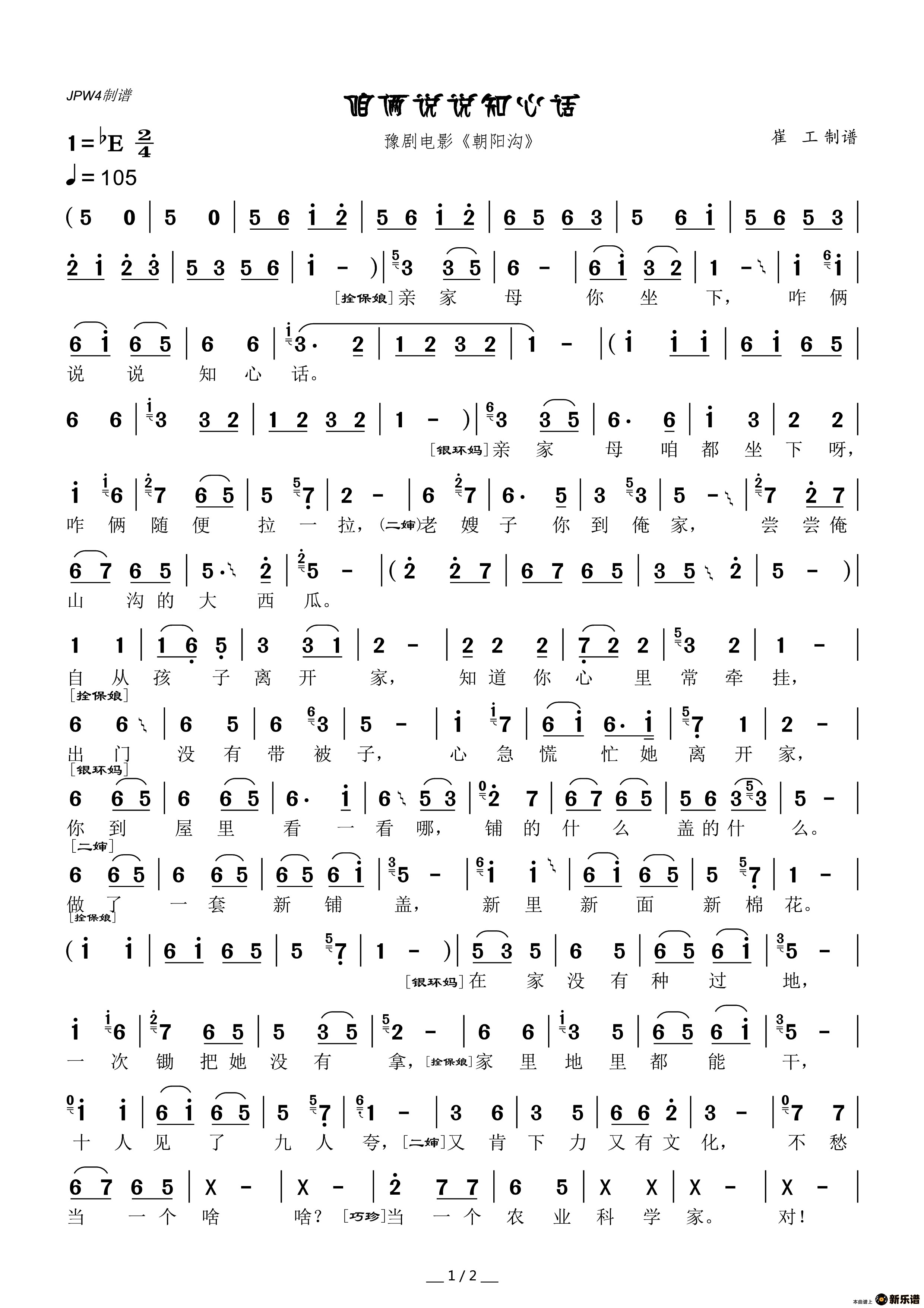 演唱的咋俩说说知心话(豫剧电影《朝阳沟》选段)歌词,咋俩说说知心话(豫剧电影《朝阳沟》选段)简谱.