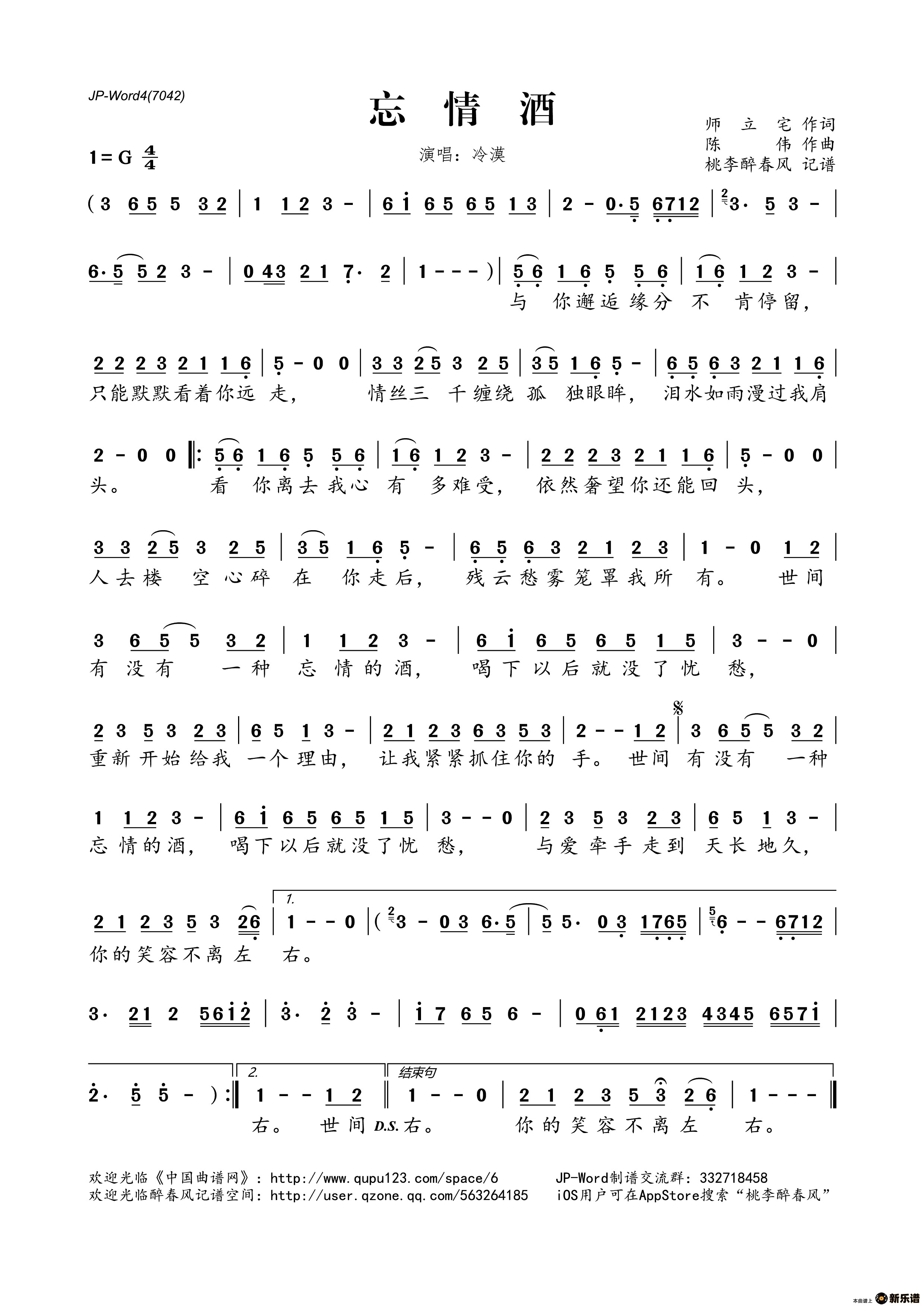 冷漠演唱的忘情酒歌词,忘情酒简谱.