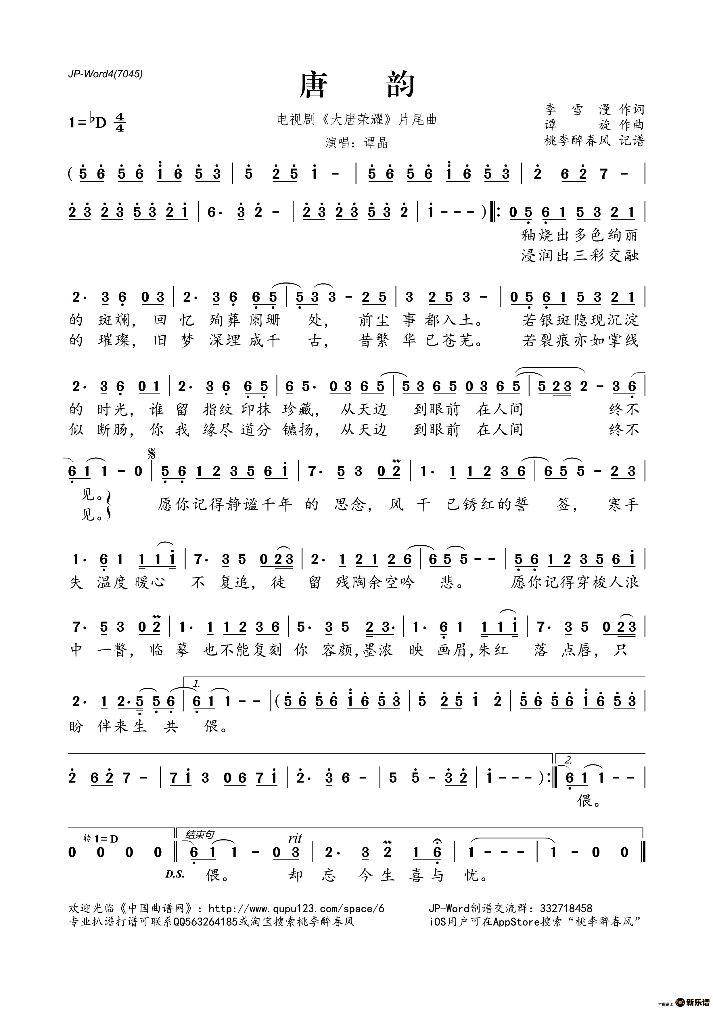 谭晶演唱的唐韵歌词,唐韵简谱.