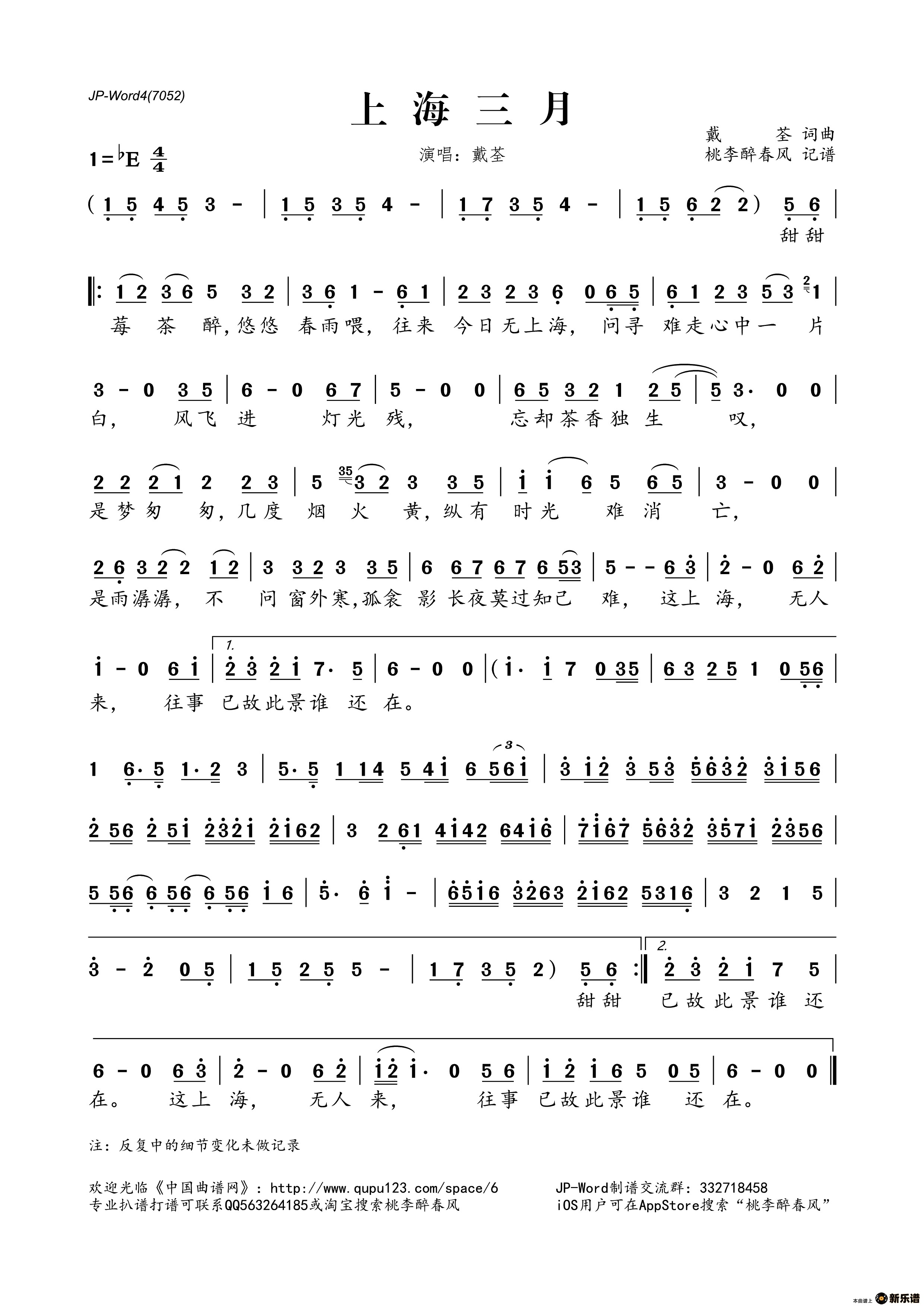 戴荃演唱的上海三月歌词,上海三月简谱.