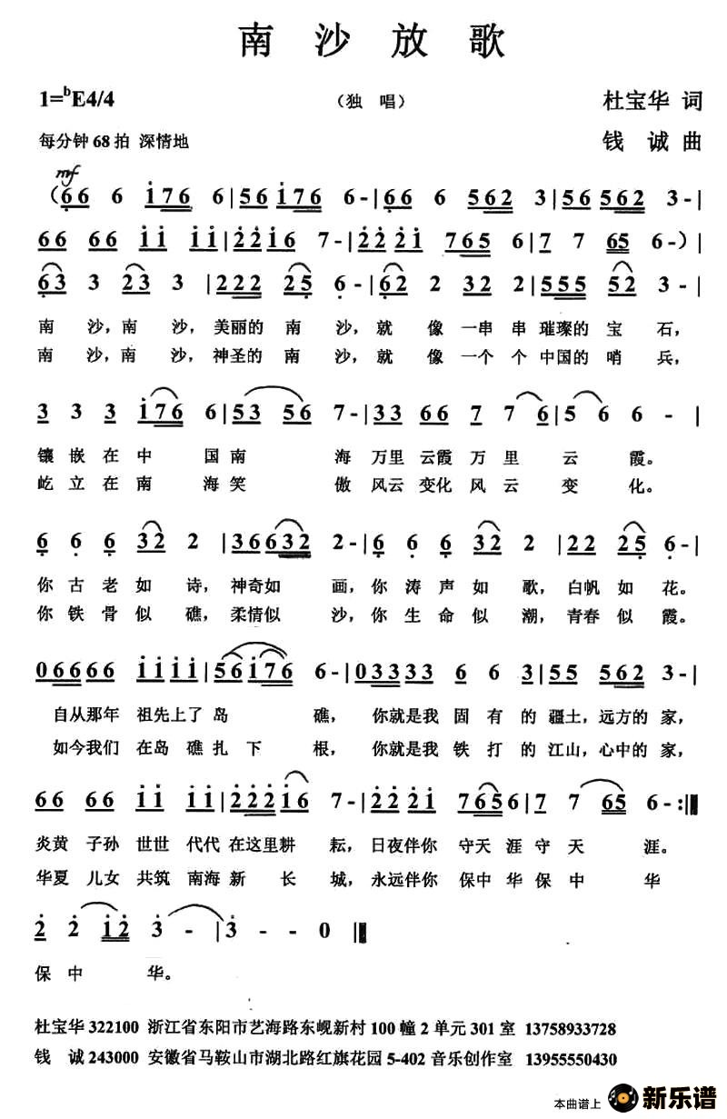 演唱的南沙放歌歌词,南沙放歌简谱.