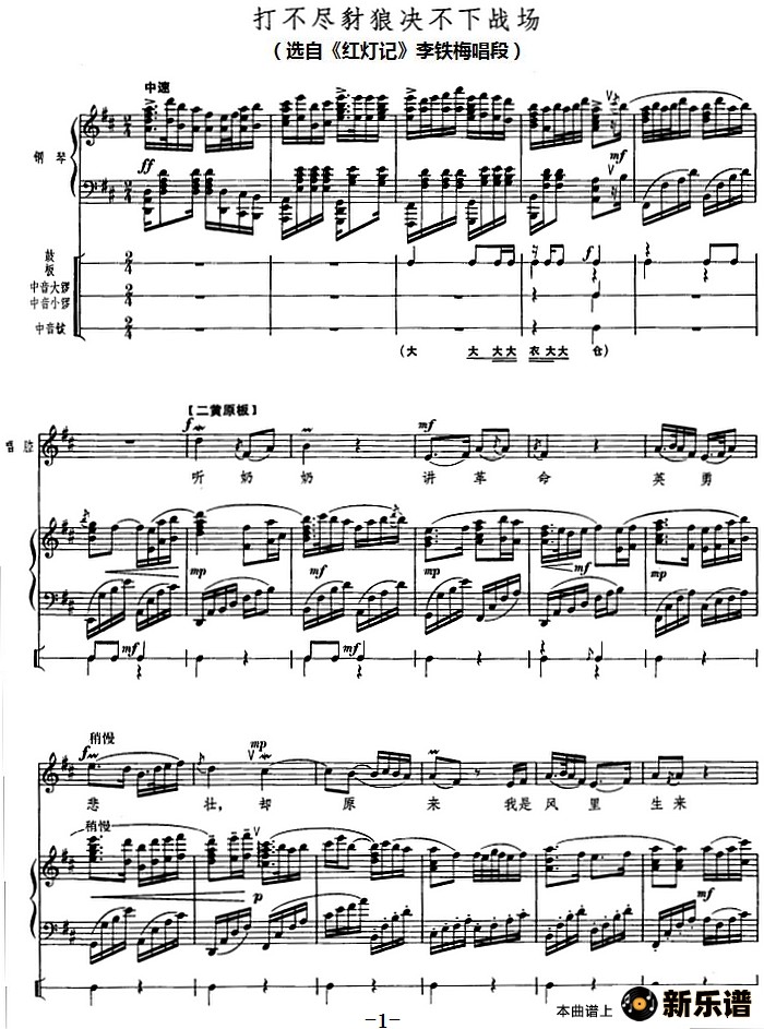 演唱的钢琴伴唱京剧《红灯记》:打不尽豺狼决不下战场(李铁梅唱段)歌词,钢琴伴唱京剧《红灯记》:打不尽豺狼决不下战场(李铁梅唱段)简谱.