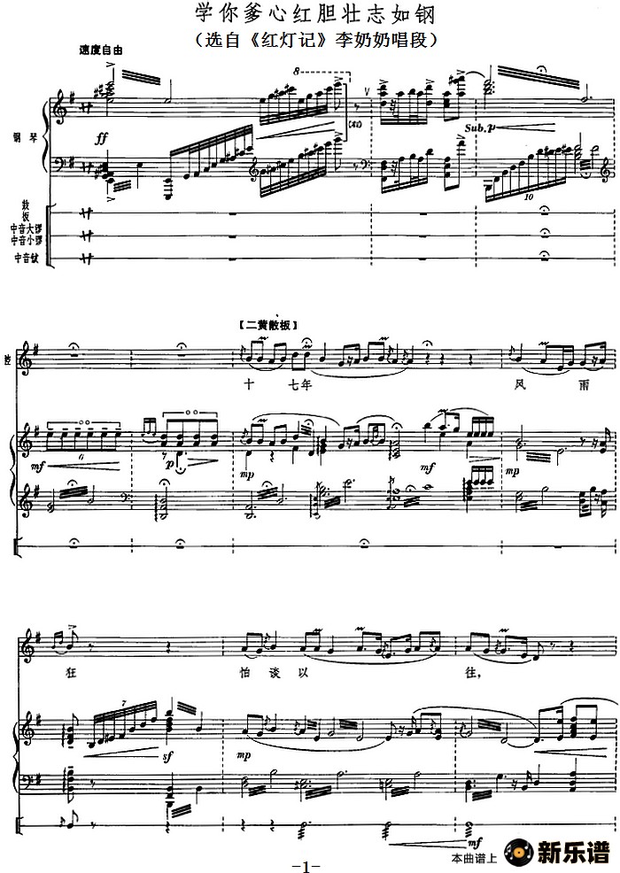 演唱的钢琴伴唱京剧《红灯记》:学你爹心红胆壮志如钢(李奶奶唱段)歌词,钢琴伴唱京剧《红灯记》:学你爹心红胆壮志如钢(李奶奶唱段)简谱.