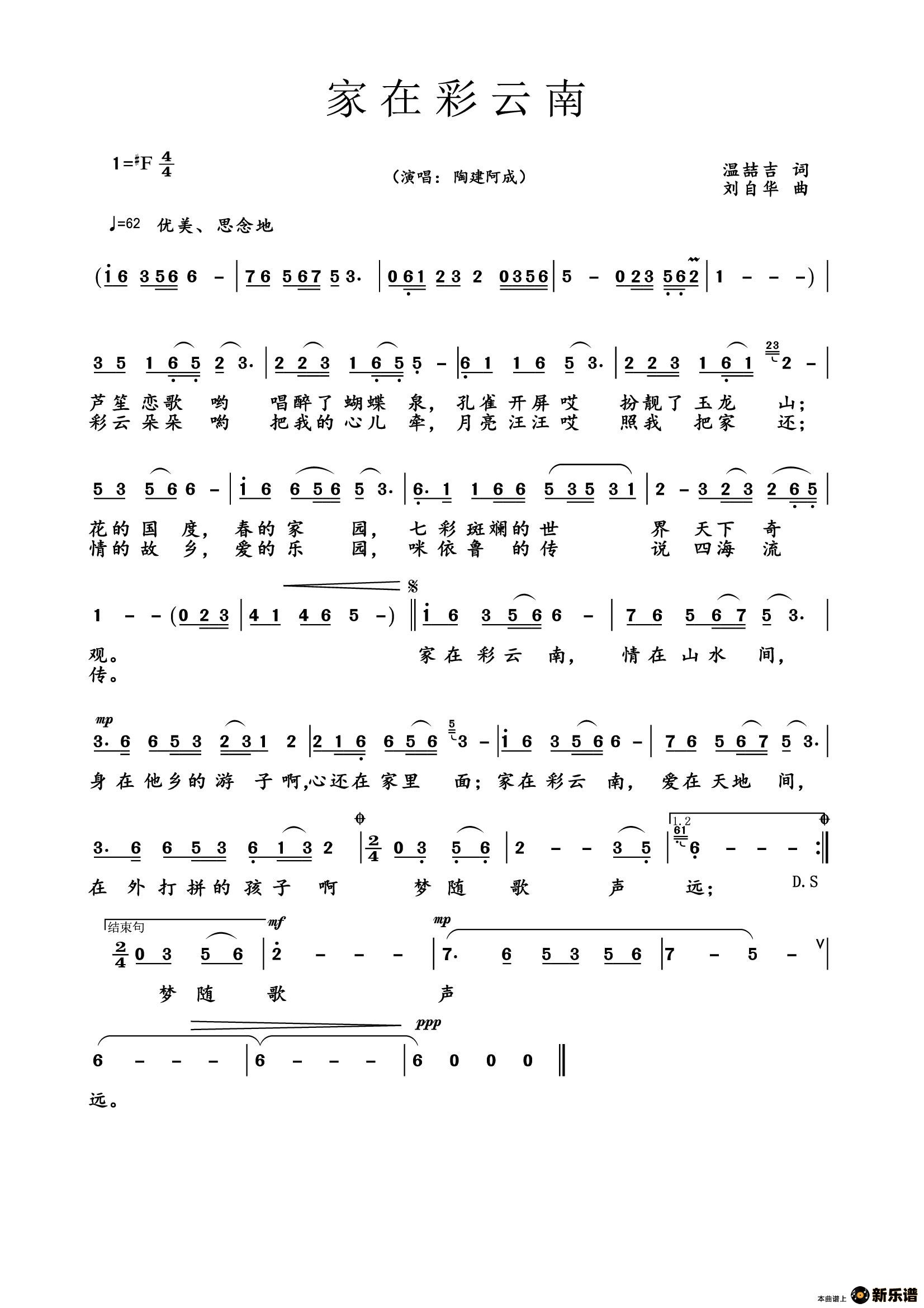陶建阿成演唱的家在彩云南歌词,家在彩云南简谱.