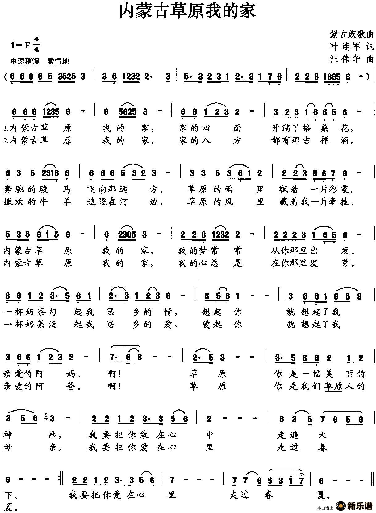 演唱的内蒙古草原我的家歌词,内蒙古草原我的家简谱.