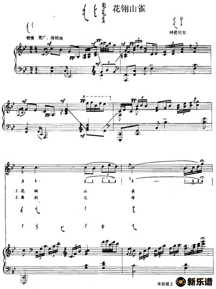 演唱的花翎山雀(蒙古文)歌词,花翎山雀(蒙古文)简谱.