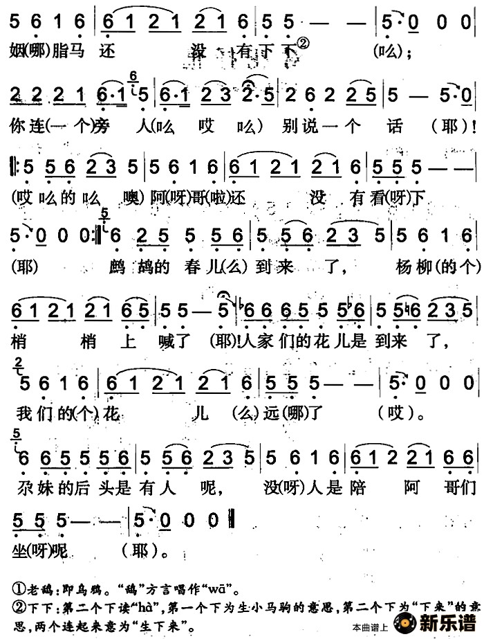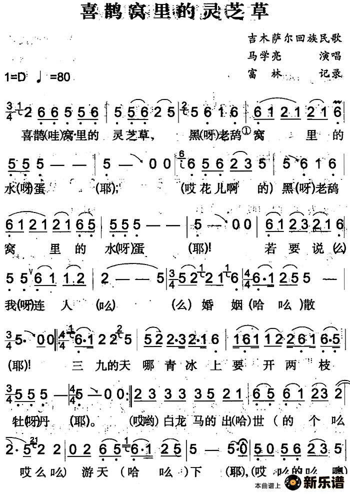 马学亮演唱的喜鹊窝里的灵芝草(吉木萨尔回族民歌)歌词,喜鹊窝里的灵芝草(吉木萨尔回族民歌)简谱.