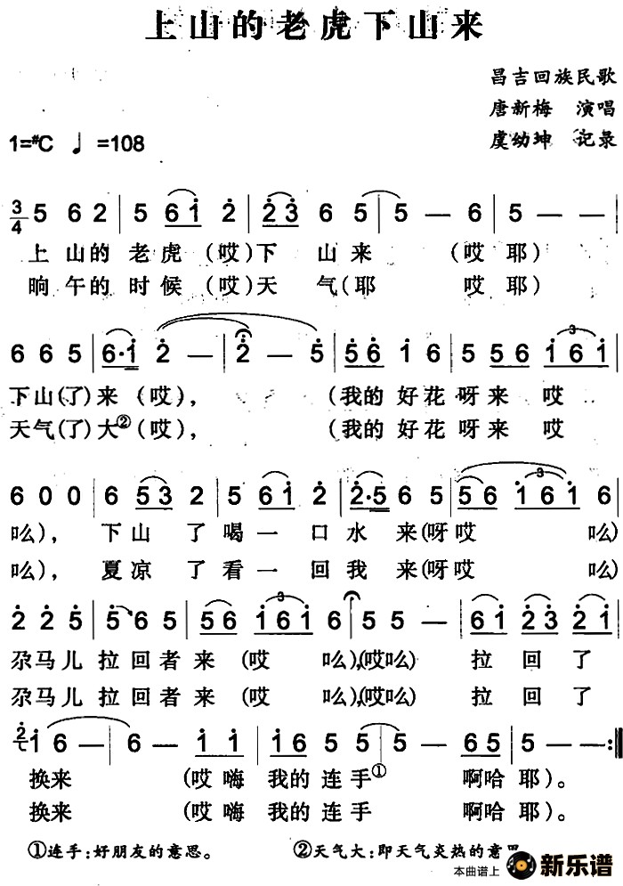 唐新梅演唱的上山的老虎下山来(昌吉回族民歌)歌词,上山的老虎下山来(昌吉回族民歌)简谱.