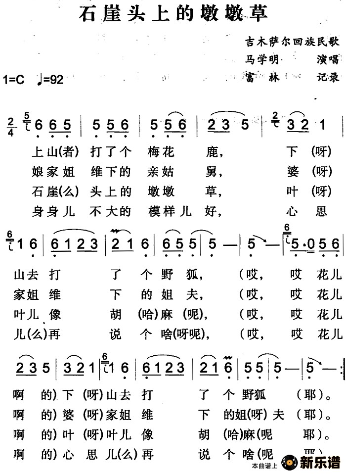 《石崖头上的墩墩草(吉木萨尔回族民歌)》简谱 马学明