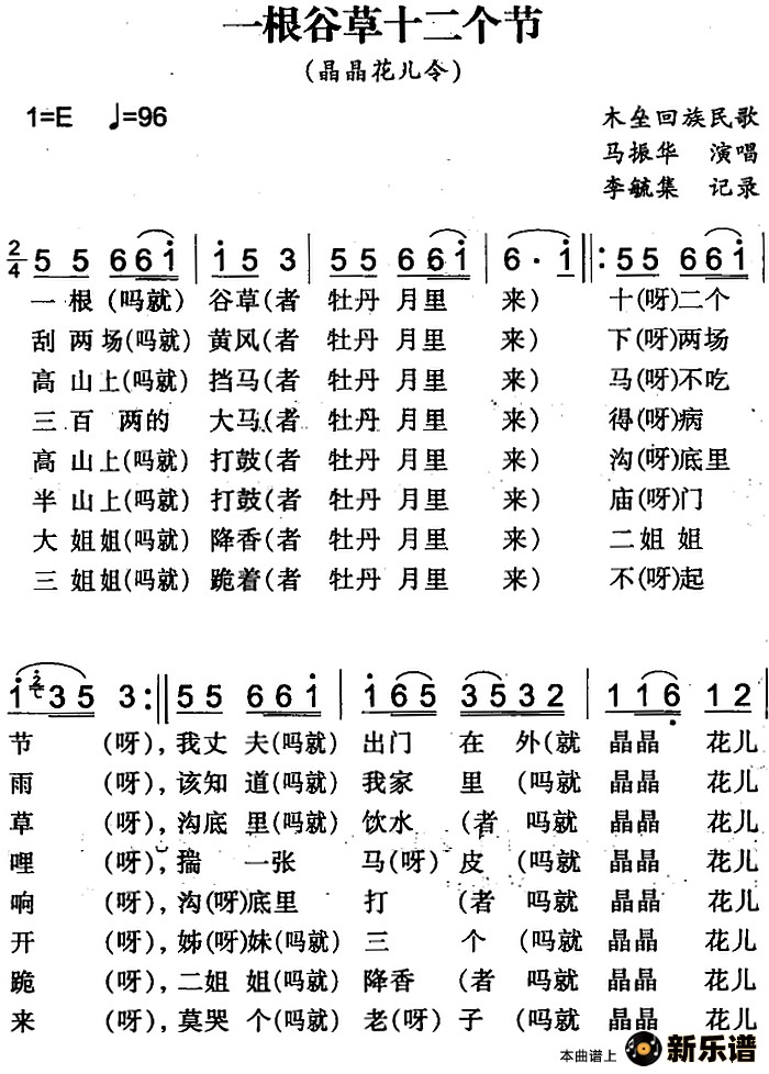 马振华演唱的一根谷草十二个节(木垒回族民歌)歌词,一根谷草十二个节(木垒回族民歌)简谱.