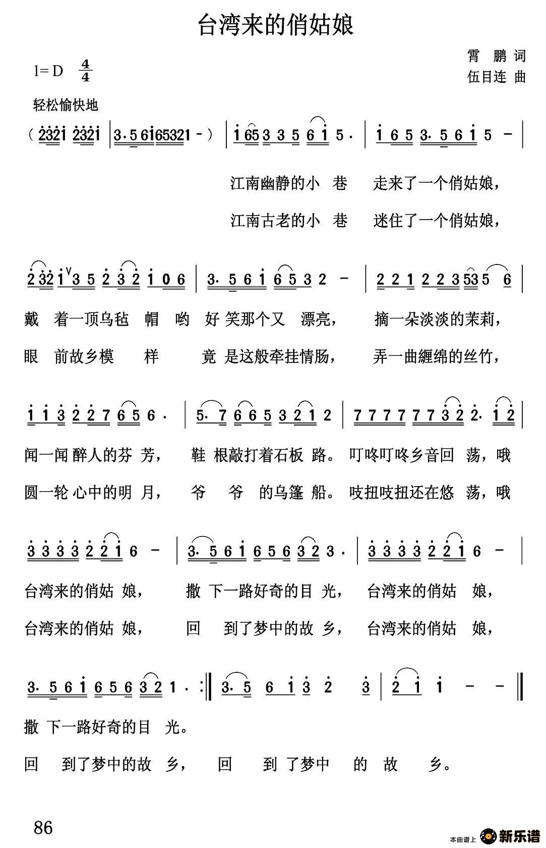 演唱的台湾来的俏姑娘歌词,台湾来的俏姑娘简谱.