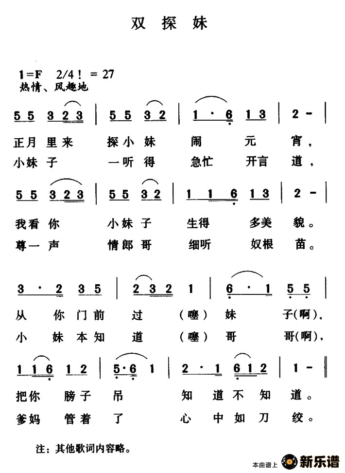 演唱的双探妹(云南大关民歌)歌词,双探妹(云南大关民歌)简谱.
