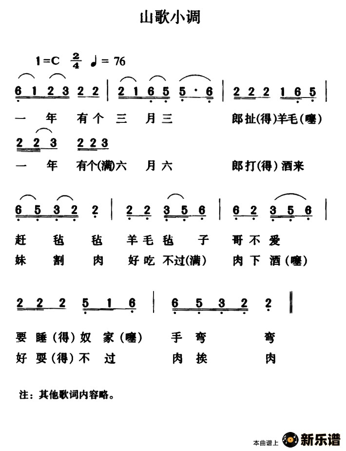 演唱的山歌小调(云南大关民歌)歌词,山歌小调(云南大关民歌)简谱.