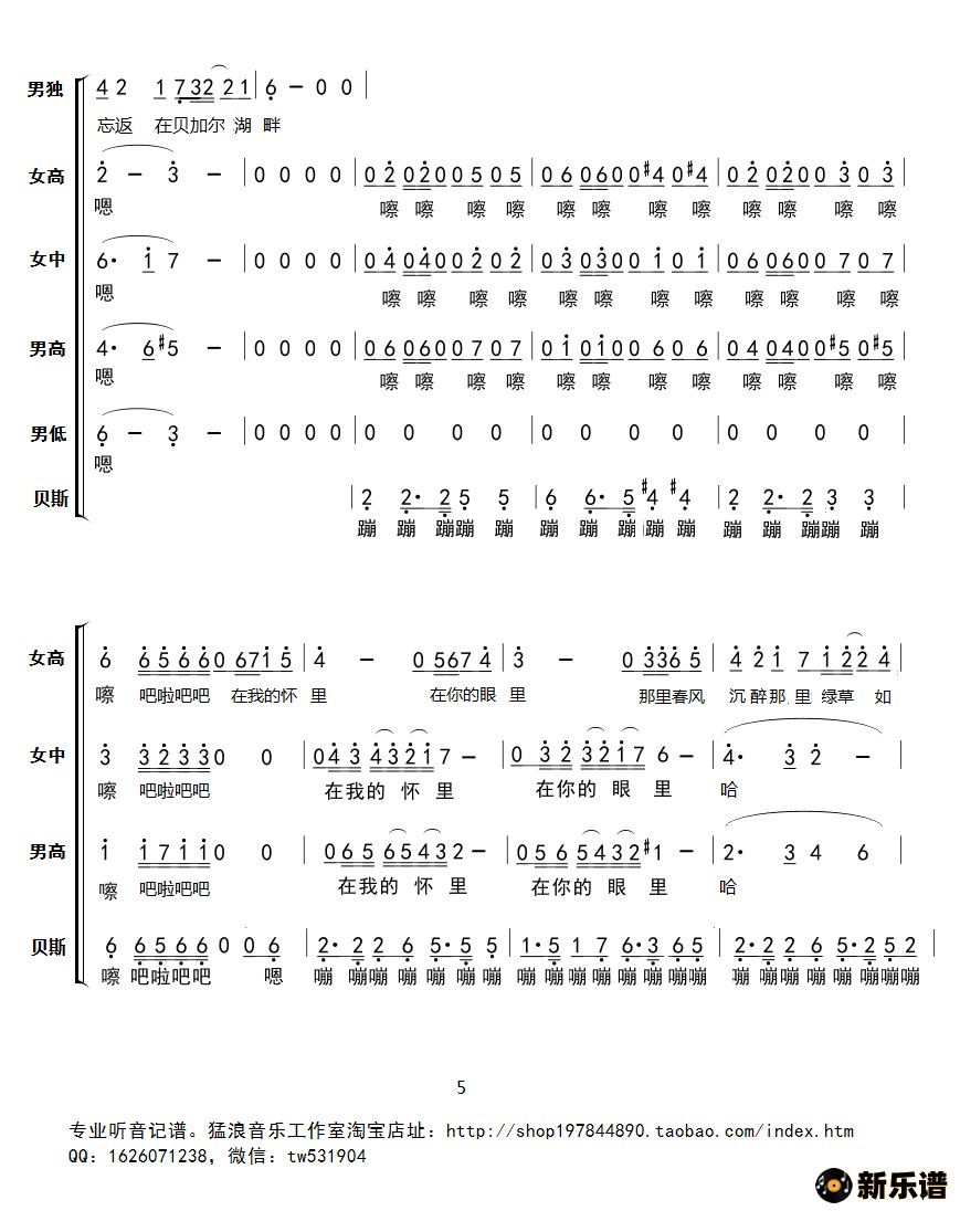 《贝加尔湖畔四声部合唱谱》简谱 李健第5张
