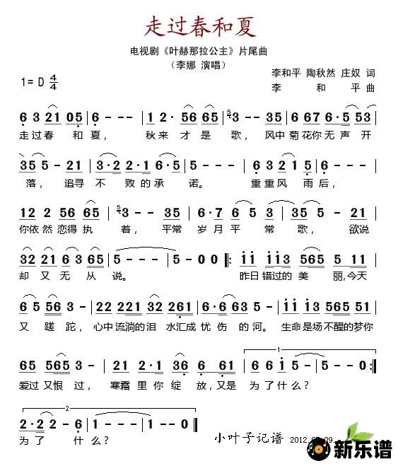 李娜演唱的走过春和夏(电视剧《叶赫那拉公主》片尾曲)歌词,走过春和夏(电视剧《叶赫那拉公主》片尾曲)简谱.
