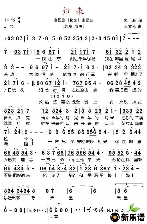 《归来(电视剧《化剑》主题曲》简谱 韩磊-小叶子制谱