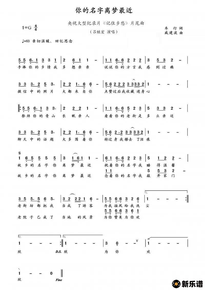 你的名字离梦很近(纪录片《记住乡愁》片尾曲)/吕继宏 相关曲谱