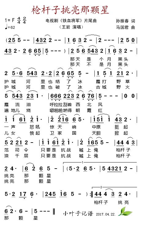 《枪杆子挑亮那颗星(电视剧《铁血将军》片尾曲)》简谱 王岩-小叶子制谱