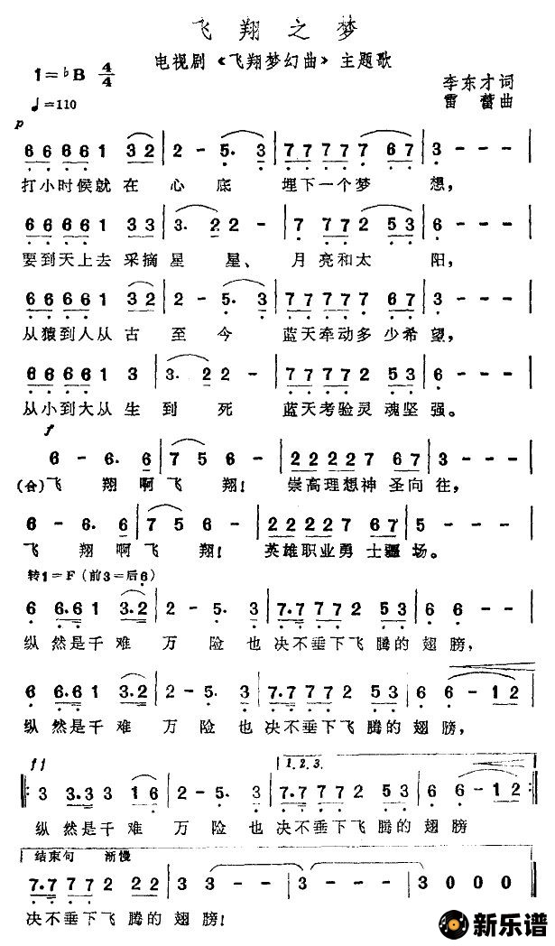 李娜演唱的飞翔之梦(电视剧《飞翔梦幻曲》主题歌)歌词,飞翔之梦(电视剧《飞翔梦幻曲》主题歌)简谱.
