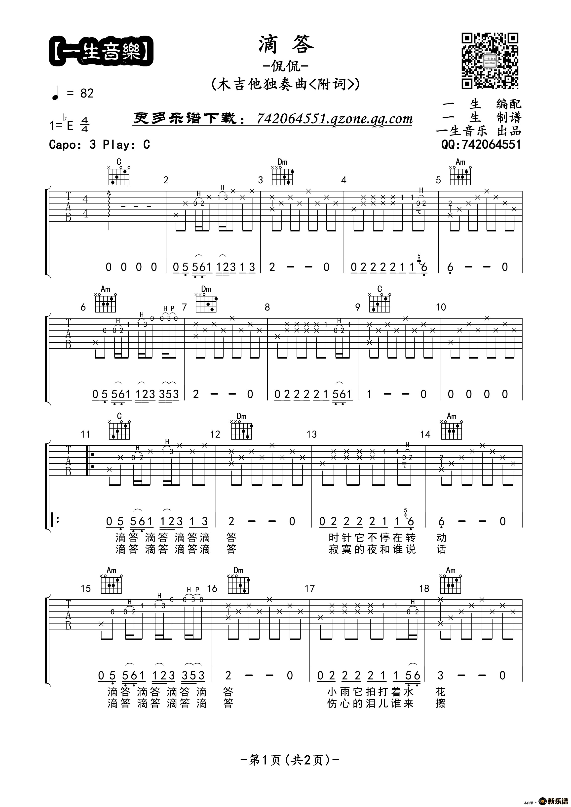 侃侃演唱的滴答(一生音乐编配版)歌词,滴答(一生音乐编配版)简谱.