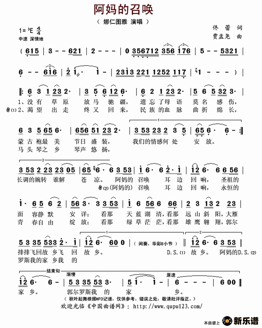 娜仁图雅演唱的阿妈的召唤歌词,阿妈的召唤简谱.