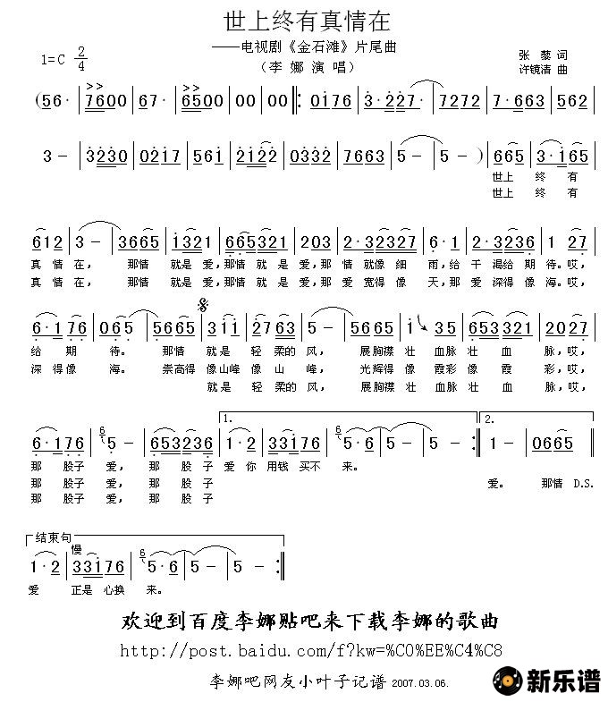 李娜演唱的世上终有真情在(电视剧《金石滩》片尾曲)歌词,世上终有真情在(电视剧《金石滩》片尾曲)简谱.