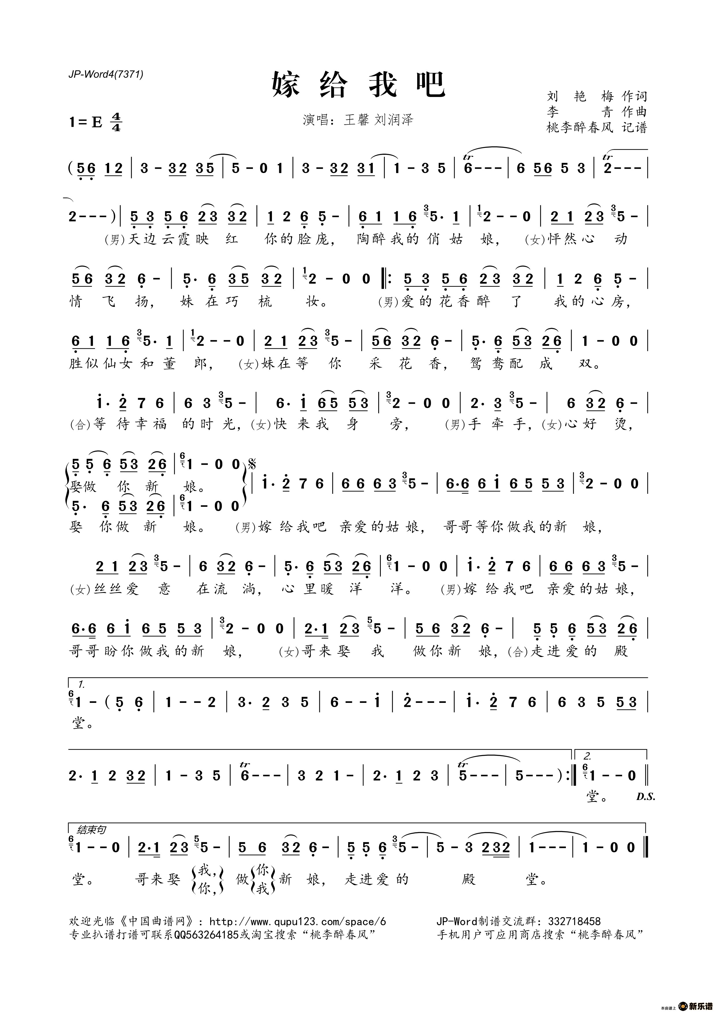 《嫁给我吧》简谱 王馨/刘润泽-桃李醉春风制谱